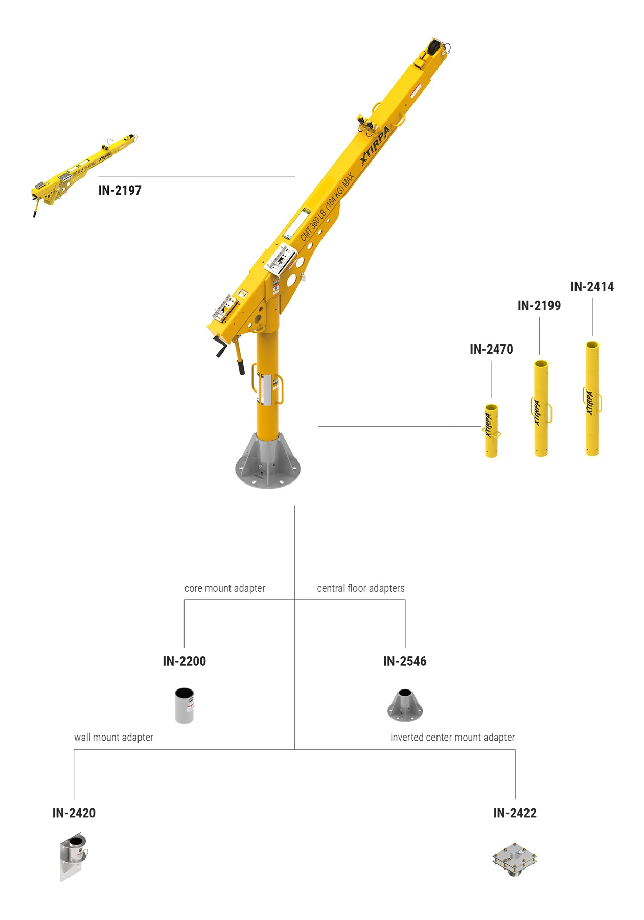 The IN-8006 system consists of the IN-2199 mast, IN-2197 davit arm, and a fixed adapter. It is ideal for vertical access in confined spaces where a fixed adapter can be anchored to the wall or floor.