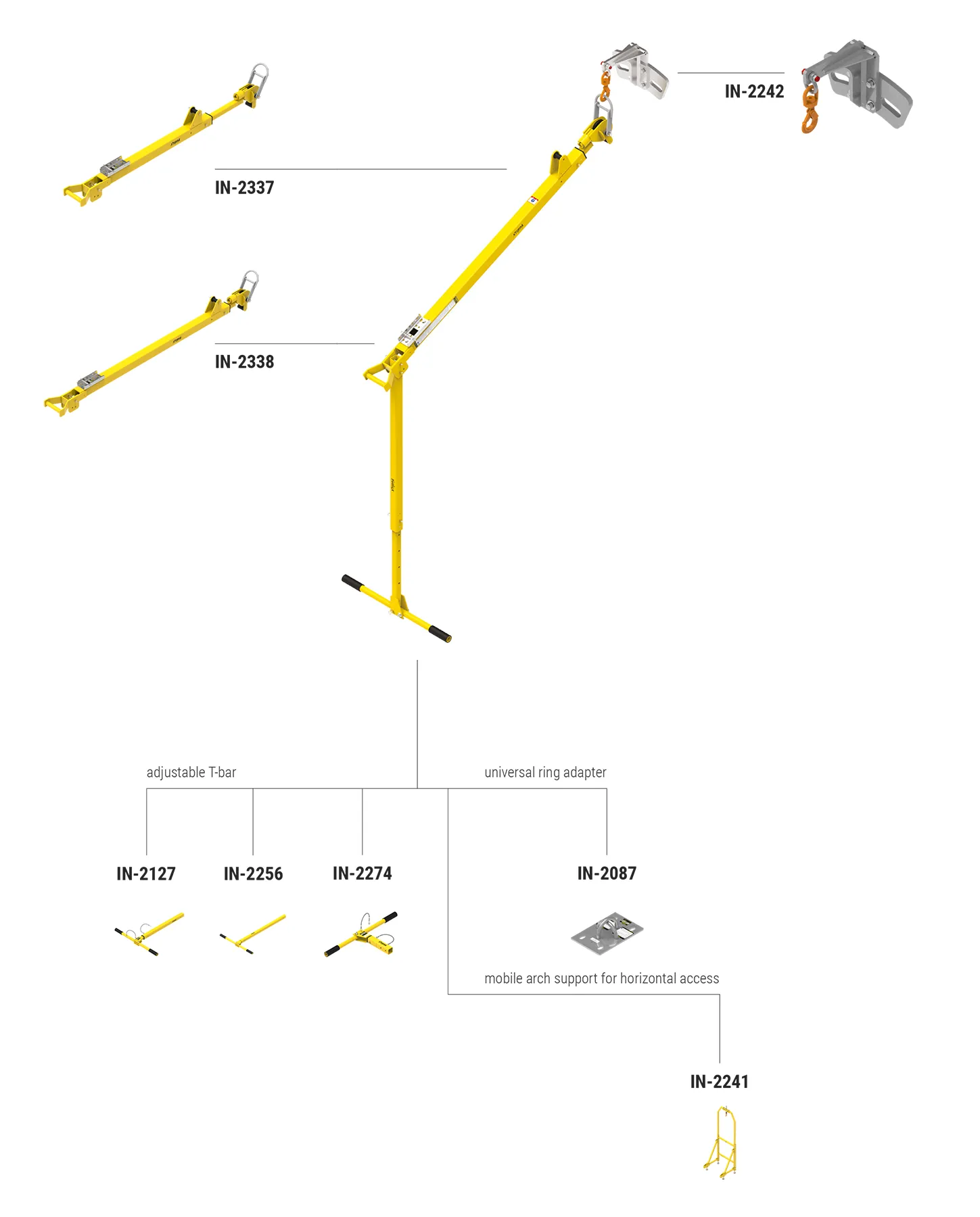 The IN-8008 is a lightweight, modular system designed for horizontal access in small spaces such as silos, tanks, or manholes. It can be equipped with IN-2337 (1,219–1,829 mm) or IN-2338 (1,440–2,586 mm) telescopic masts for various location setups. Adjustable T-feet can also be added for improved stability during horizontal or semi-vertical use.